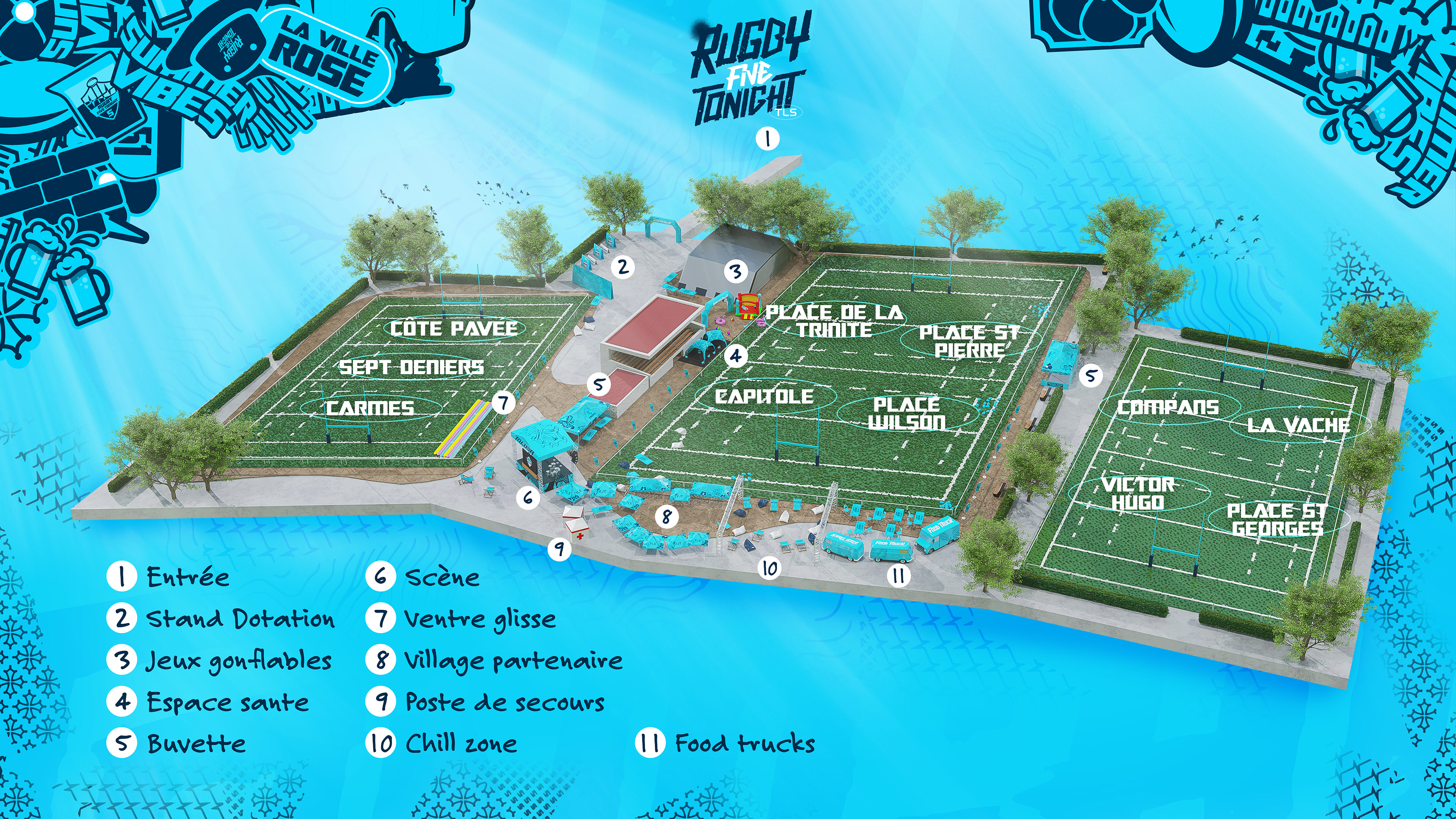 Dans le cadre de l’édition 2024 du Rugby Five Tonight, nous réalisons des assets 3D et le plan du festival afin d’offrir une visualisation immersive et détaillée de l’événement.