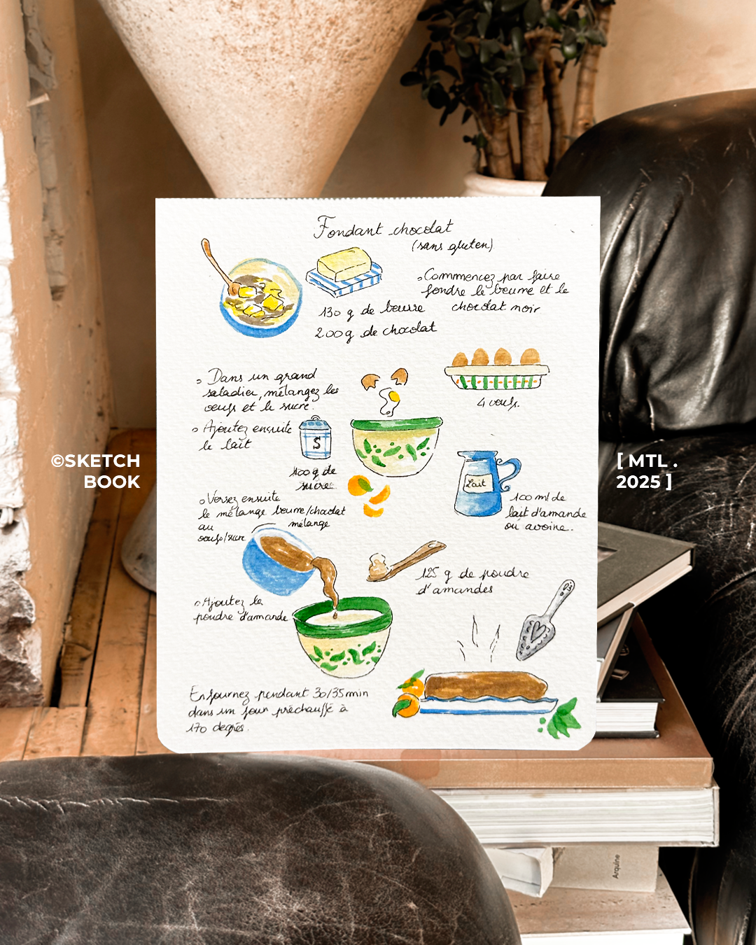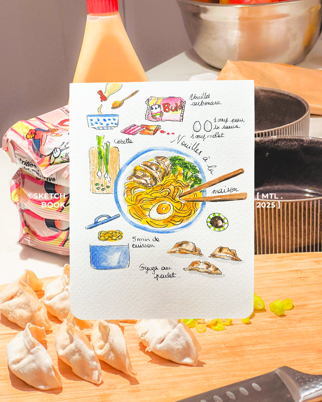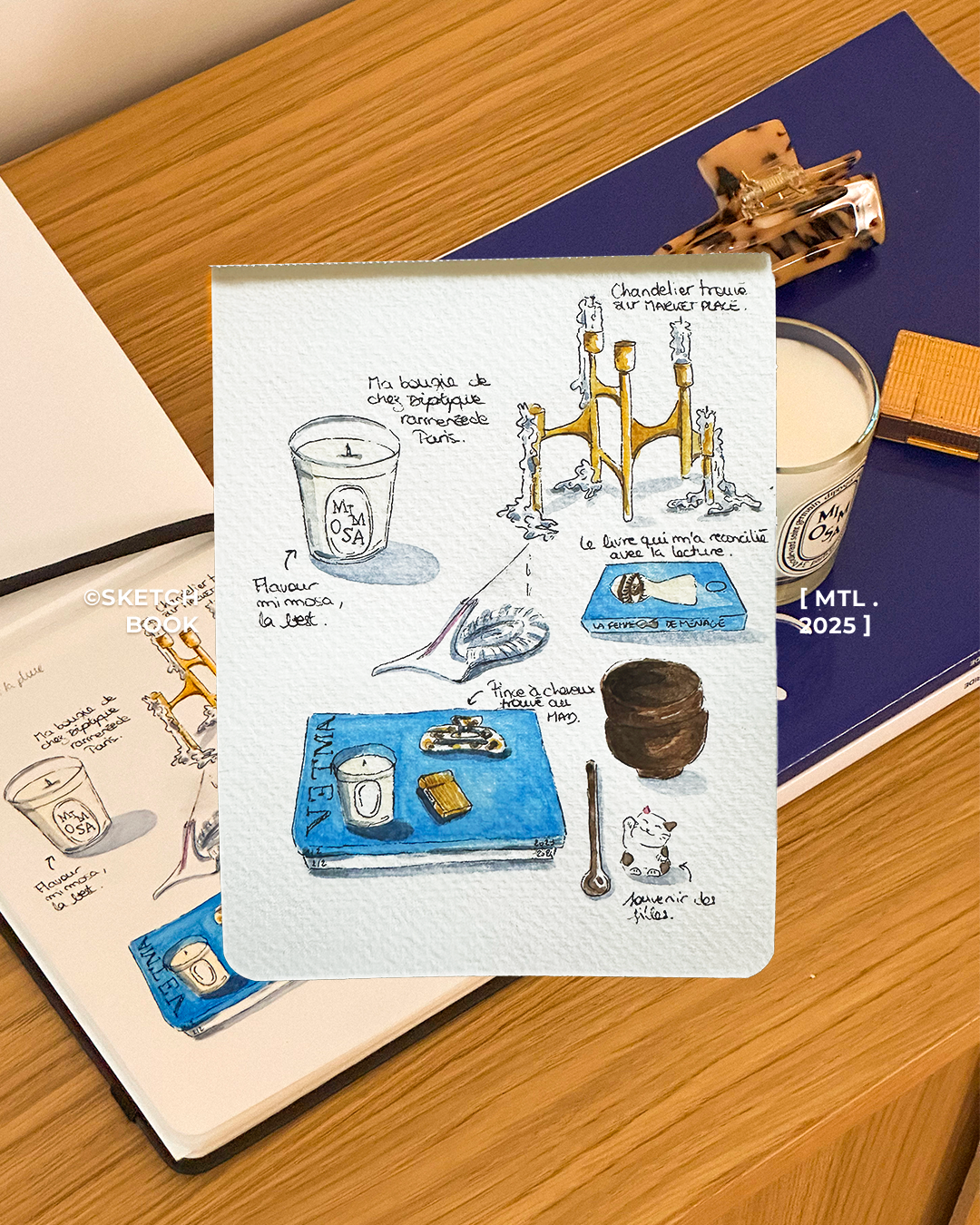 Ce carnet est mon laboratoire personnel, un espace de liberté totale où chaque page est une invitation à l'expérimentation. Entre deux recettes de cuisine illustrées et des fragments de vie capturés sur le vif, je m'en sers pour tester de nouvelles techniques et explorer des palettes chromatiques. C'est ici que le banal devient une histoire.